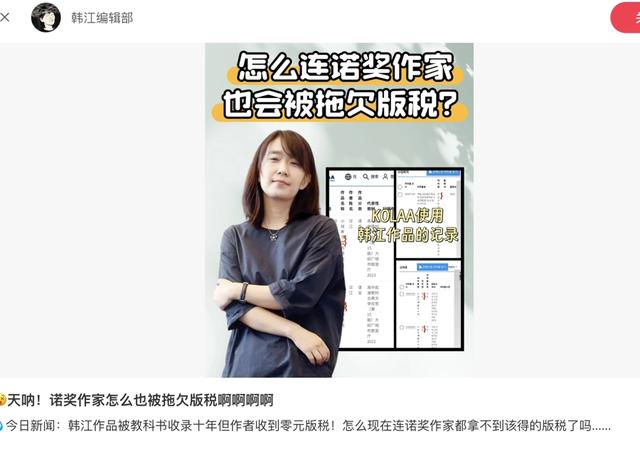 ▷诺奖作家作品被收录十年,竟然从未收到版权费?小红书博主“韩江编辑部”近日发布了一条笔记,指出诺奖得主韩江的文章被广泛收录到韩国教科书、教育出版物中,但过去的十年里,韩江竟从未收到过版权费。韩国作家张康明也在社交平台表示,只有作家主动提出申请才能支付稿酬,这种制度太不合理。而另一漏洞也在于作家有时并不知道自己的作品被录用,这也导致每年有近10亿韩元版权费无人认领。