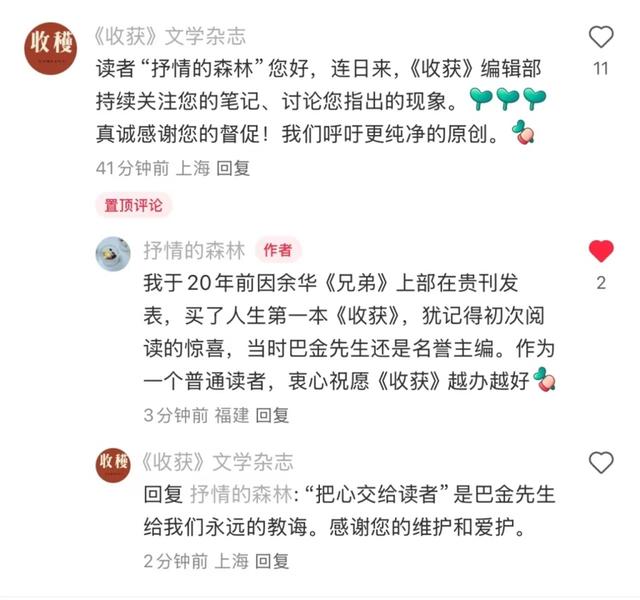 ▷《收获》《花城》《天涯》等文学杂志呼应坚决支持原创。博主“抒情的森林”发布的多条笔记指出多位作家作品与其他作品有“异曲同工”“高度重合”之处,这也引发了文学圈的“鉴抄”风波。近日,多家文学期刊再次重申支持原创,《收获》杂志在博主评论区公开回应:“真诚感谢您的督促!我们呼吁更纯净的原创。”《花城》杂志表示从2025年第4期开始启用查重软件辅助把关作品内容。《天涯》杂志也发表声明重申期刊“原创、首发”原则,坚决反对抄袭。